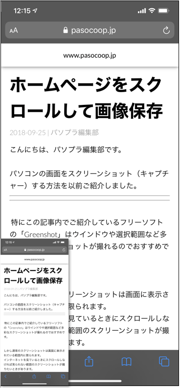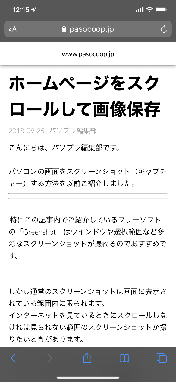 まずは、safariで見たいホームページを開きます。(下に長いページを開けてくださいね)ここでは、パソプラの2018.09.25の記事を表示しています。
