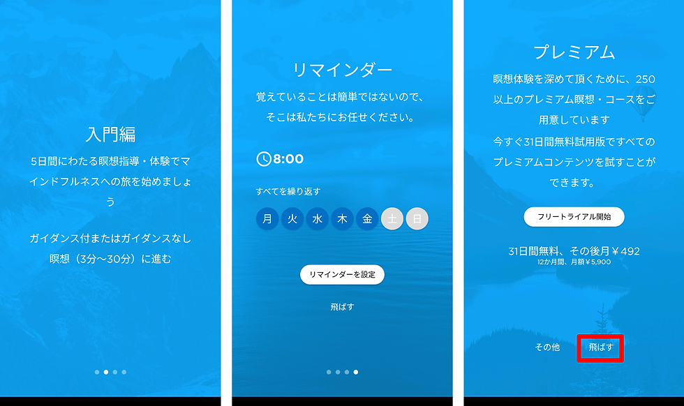 プレミアムはフリートライアル開始を押すと31日後有料になるので注意!「飛ばす」でいいでしょう。