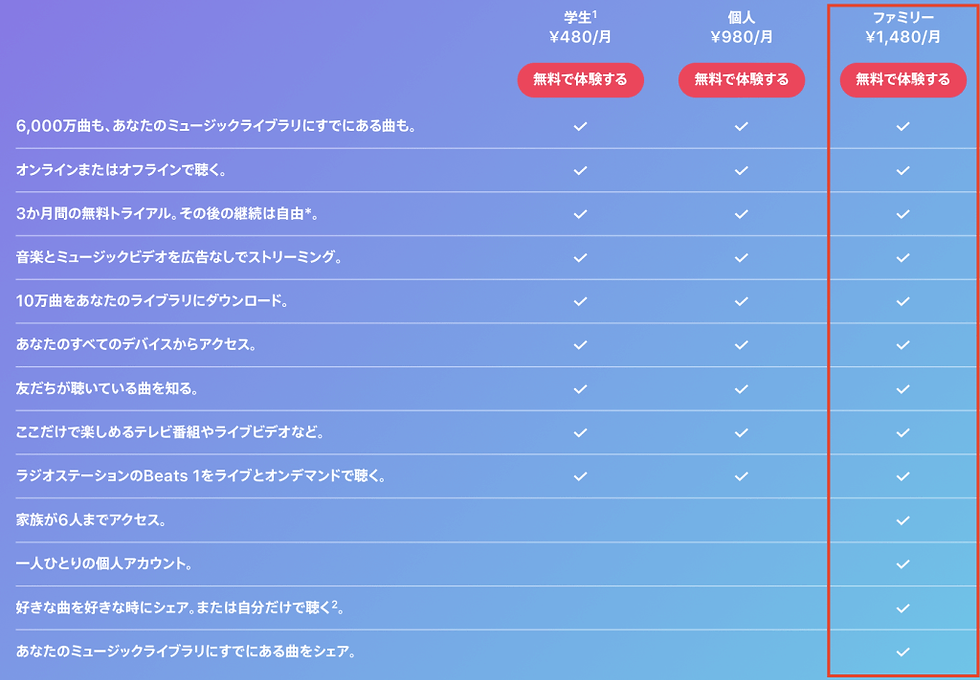 サブスクリプションの音楽聴き放題サービス「Apple Music」の「ファミリープラン」(月額1,480円)を契約するとファミリー共有のメンバー間で共有することができます。 音楽好きな家庭には個々で契約するよりもお得です。