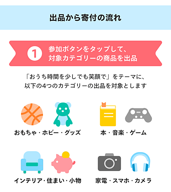 「おうち時間を少しでも笑顔で」をテーマに、対象カテゴリーの商品を出品すると